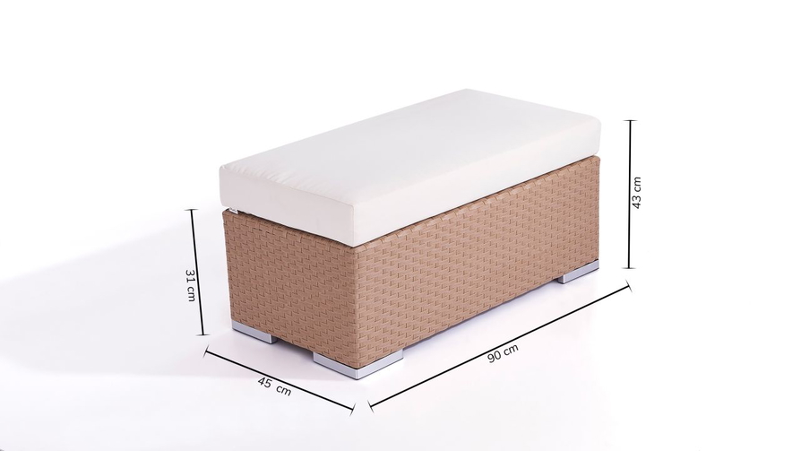 Kissen & Auflagen 12 cm dicke Sitzauflage, Schaumstoff, hoher Sitzkomfort Gewicht Hocker ca. 5 kg Material Polyrattan Montage Montage nicht erforderlich Lieferumfang inkl. Verbindungsklammern Sitzplätze bis zu 2 Obermaterial Hochwertiges Polyrattan, 12 mm breit, angeraut, wasserfest, 100% handgeflochten, einfarbig, durchgefärbt, Farbe: beige Gestell Aluminium, pulverbeschichtet, Stärke bis zu 1,2 mm, robust, rostfrei, wetterbeständig Bezug crema, 100% Polyester, abnehmbar, waschbar bei 30°C, robuste Verarbeitung, hohe Festigkeit, verdeckte Reißverschlüsse, einfarbig2, durchgefärbt2, vorimprägniert2 Eigenschaften Traglast bis zu 120 kg pro Sitzplatz, wetterbeständig, pflegeleicht, Kunststoff-Füße mit Alu Blende in Edelstahl-Optik, Hocker als Tisch nutzbar SKU 902111101 Bezpečnostní pokyny